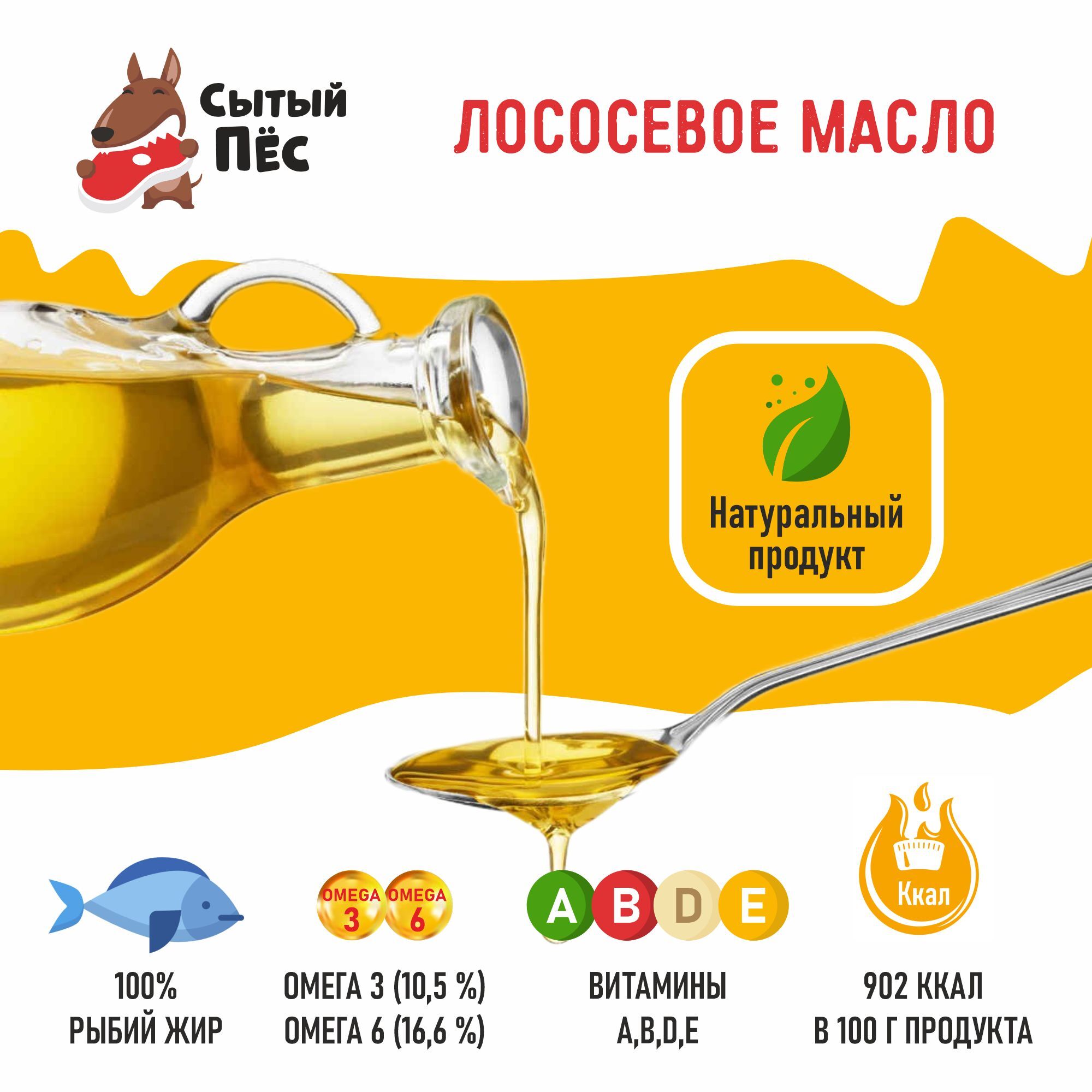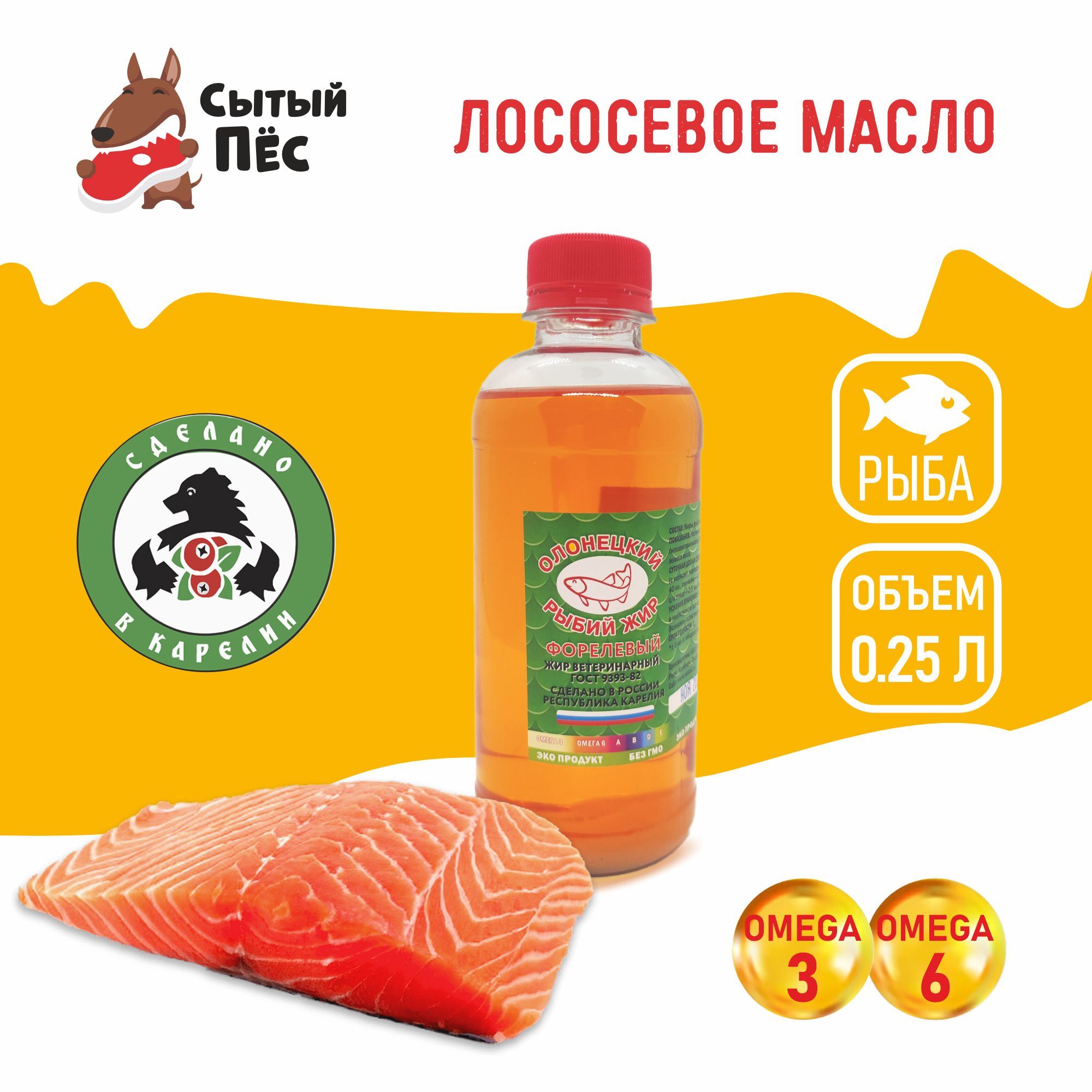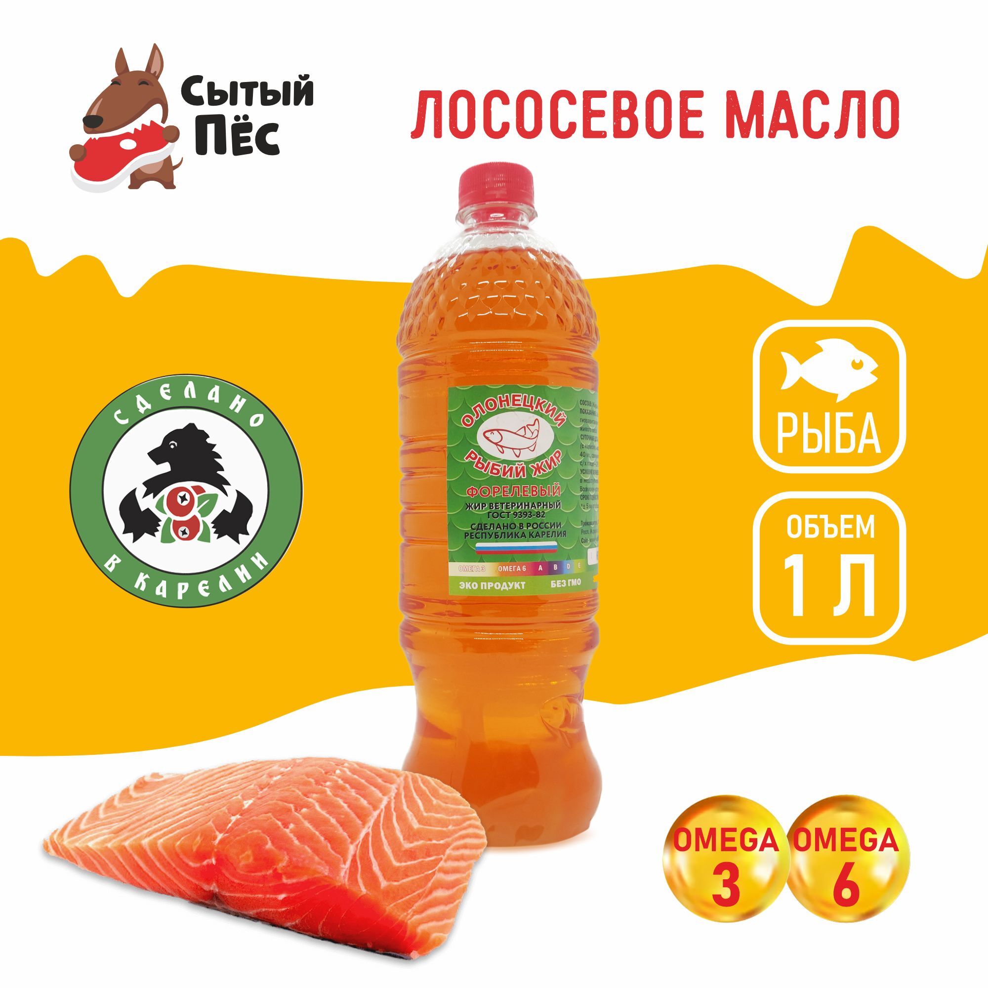 Лососевое масло от бренда “Олонецкий рыбий жир” - это экологически чистый продукт, изготовленный с соблюдением всех норм по ГОСТ 9393-82, из рыбы лососевых пород, прямиком из Карелии! Продукт не содержит искусственных ароматизаторов, консервантов и других вредных добавок.Форелевый рыбий жир является незаменимой добавкой к основному корму для собак, кошек, птиц и парнокопытных животных. Рыбий жир является ценным источником омега-3 и омега-6 жирных кислот, богат витамина A, B, D, E.Омега-3 и Омега-6 жирные кислоты помогают поддерживать здоровую кожу и блестящую шерсть у животных, способствуют улучшению кровообращения и имеют противовоспалительные свойства, снижая риск воспалений и развития нежелательных новообразований. Жирные кислоты играют важную роль в развитии животных, особенно у молодых особей. Помогает поддержать здоровье глазных тканей, что особенно важно для особей, страдающих от проблем со зрением.Также рыбий жир укрепляет иммунную систему, улучшает пищеварение и способствует нормализации работы ЖКТ.Еще одно полезное свойство - улучшение мозговой функции у животных, что способствует повышению когнитивных функций.Из ветеринарной практики - рыбий жир очень полезен в профилактике и лечении гипоавитаминозов, рекомендуется при низком потреблении кормов и слабом приросте живого веса.Регулярное употребление форелевого рыбьего жира может способствовать общему улучшению здоровья животных, делая их более энергичными, активными и счастливыми.Самое главное, “Олонецкий рыбий жир” - это очень полезный и питательный продукт, который поможет Вашему любимцу оставаться здоровыми и активными на протяжении всей жизни!