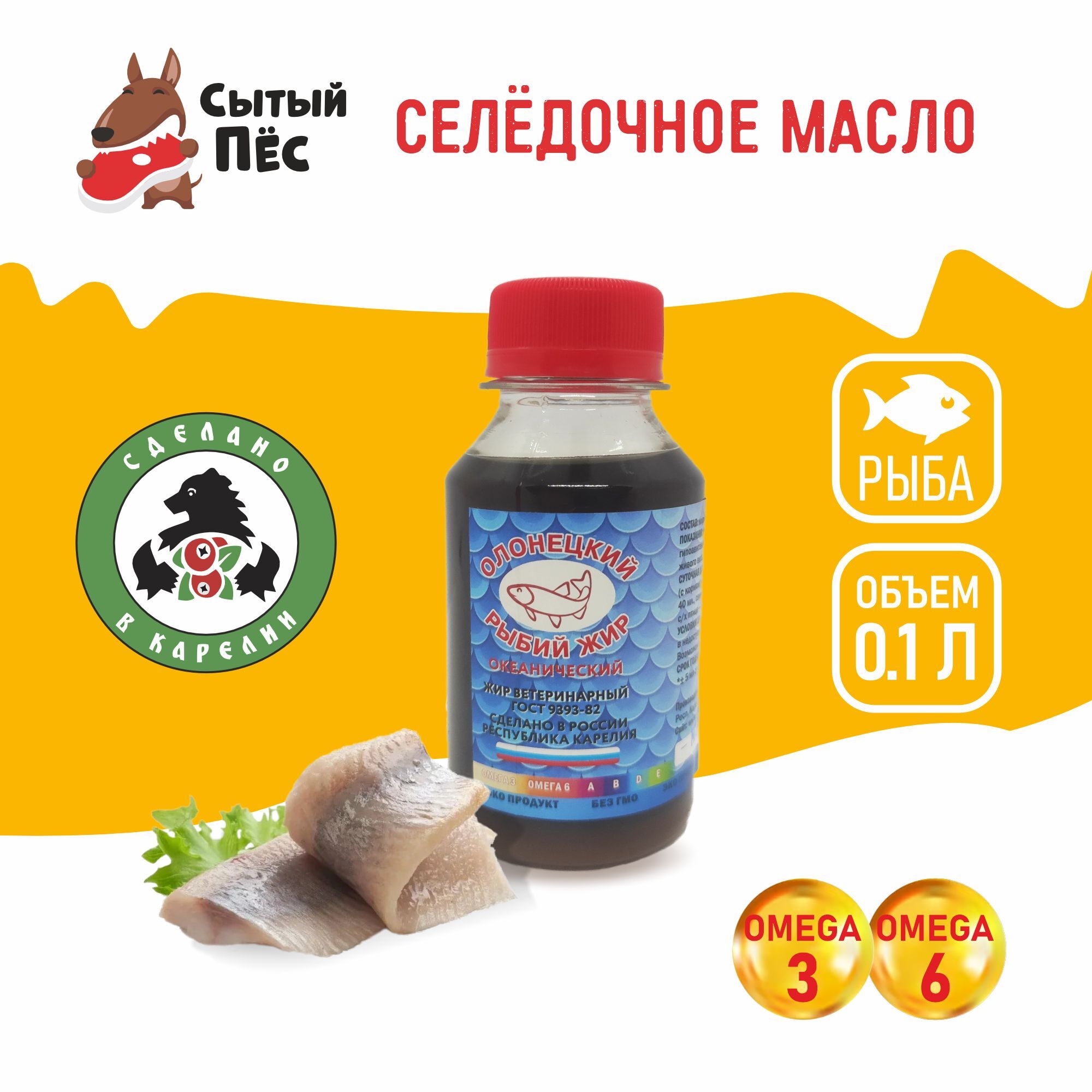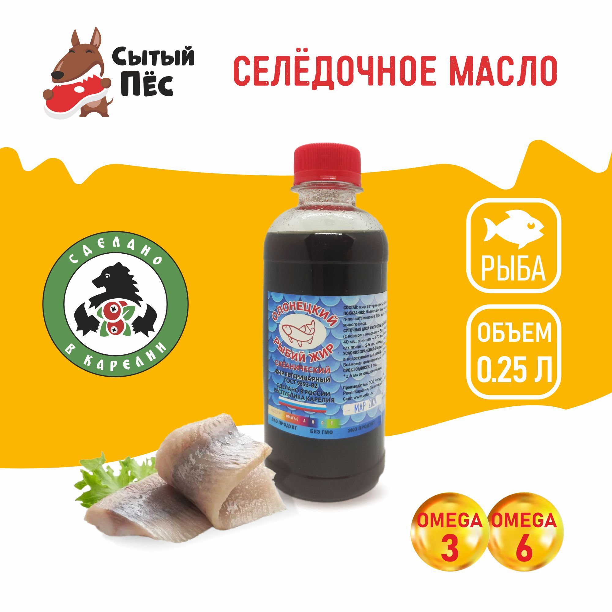 Сельдевый рыбий жир от бренда “Олонецкий рыбий жир” - это экологически чистый продукт, изготовленный с соблюдением всех норм по ГОСТ 9393-82, из рыбы сельдевых пород, прямиком из Карелии! Продукт не содержит искусственных ароматизаторов, консервантов и других вредных добавок.Сельдевый рыбий жир является незаменимой добавкой к основному корму для собак, кошек, птиц и парнокопытных животных. Рыбий жир является ценным источником омега-3 и омега-6 жирных кислот, богат витамина A, B, D, E.Омега-3 и Омега-6 жирные кислоты помогают поддерживать здоровую кожу и блестящую шерсть у животных, способствуют улучшению кровообращения и имеют противовоспалительные свойства, снижая риск воспалений и развития нежелательных новообразований. Жирные кислоты играют важную роль в развитии животных, особенно у молодых особей. Помогает поддержать здоровье глазных тканей, что особенно важно для особей, страдающих от проблем со зрением.Также рыбий жир укрепляет иммунную систему, улучшает пищеварение и способствует нормализации работы ЖКТ.Еще одно полезное свойство - улучшение мозговой функции у животных, что способствует повышению когнитивных функций.Из ветеринарной практики - рыбий жир очень полезен в профилактике и лечении гипоавитаминозов, рекомендуется при низком потреблении кормов и слабом приросте живого веса.Регулярное употребление селедочного рыбьего жира может способствовать общему улучшению здоровья животных, делая их более энергичными, активными и счастливыми.Самое главное, “Олонецкий рыбий жир” - это очень полезный и питательный продукт, который поможет Вашему любимцу оставаться здоровыми и активными на протяжении всей жизни!"