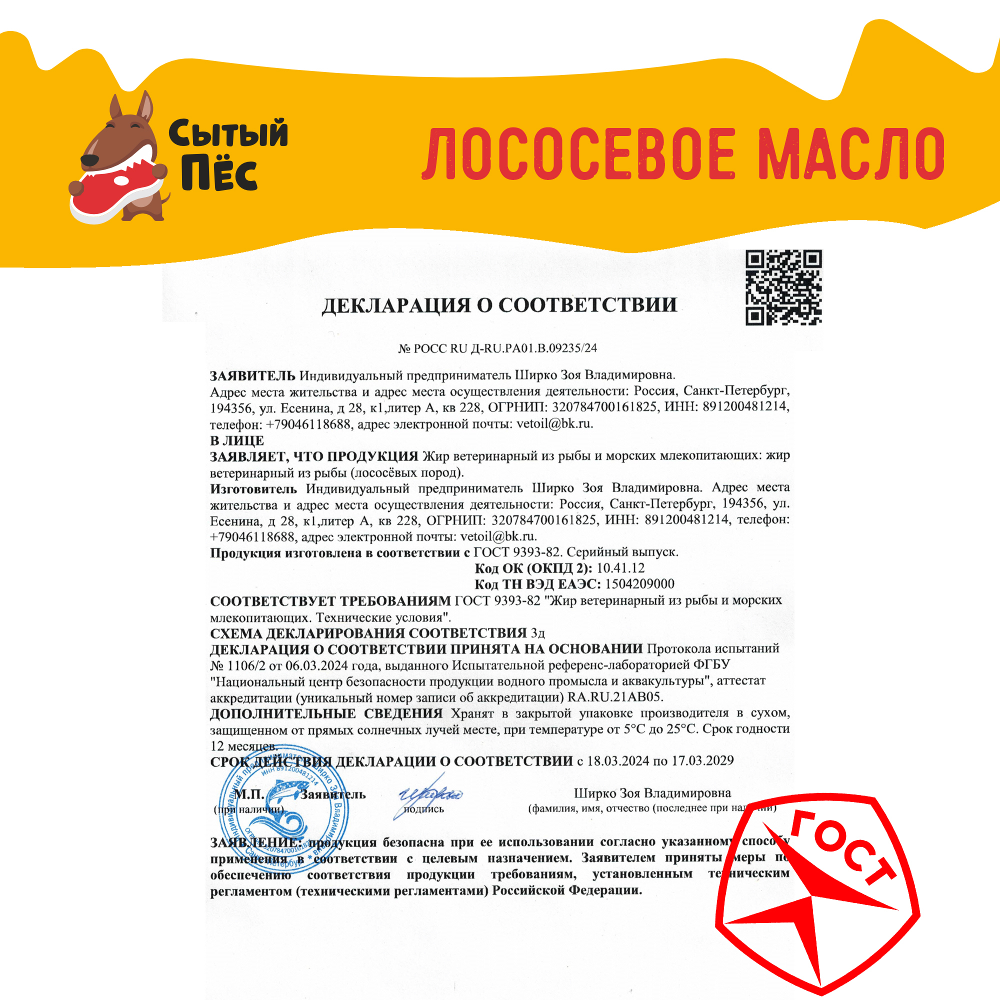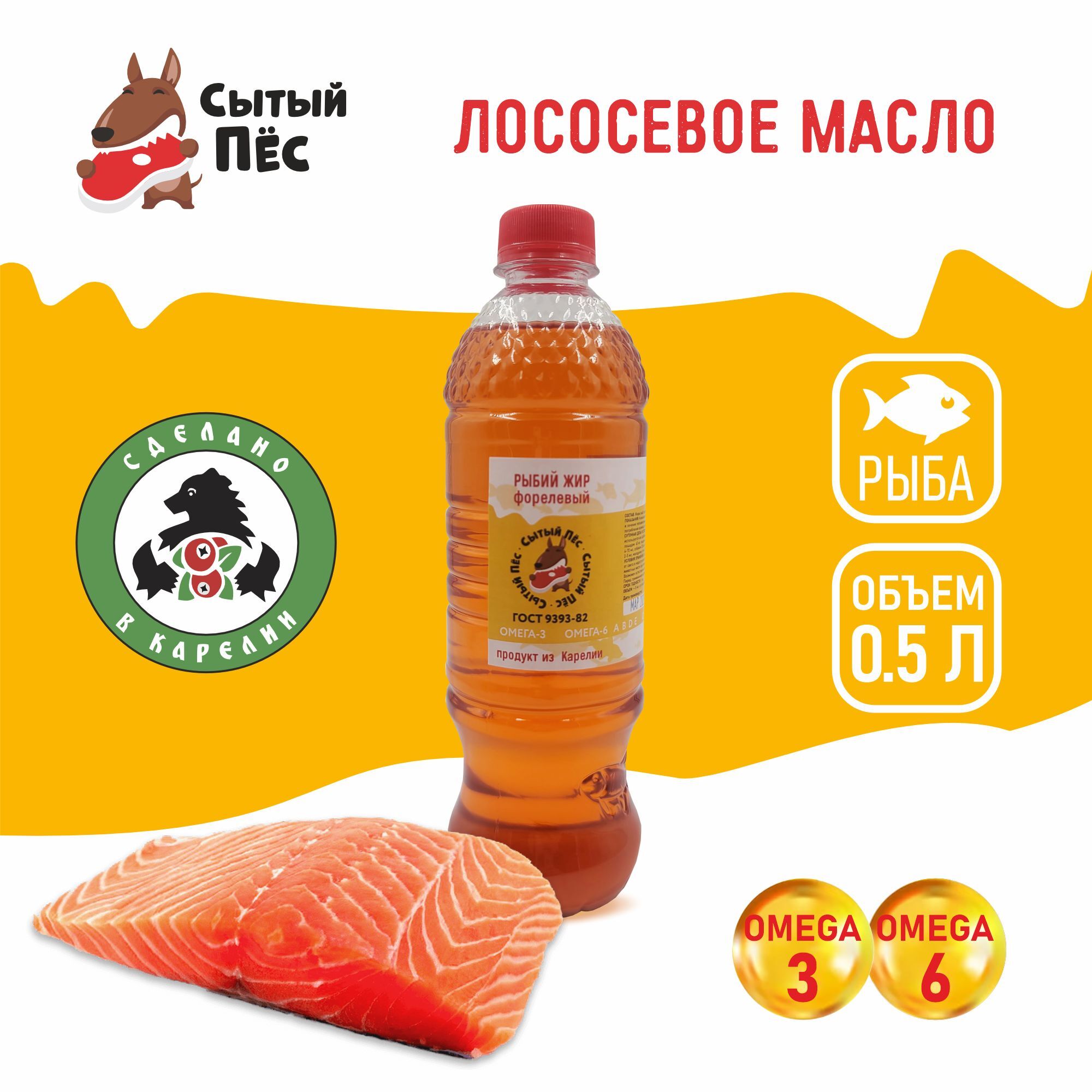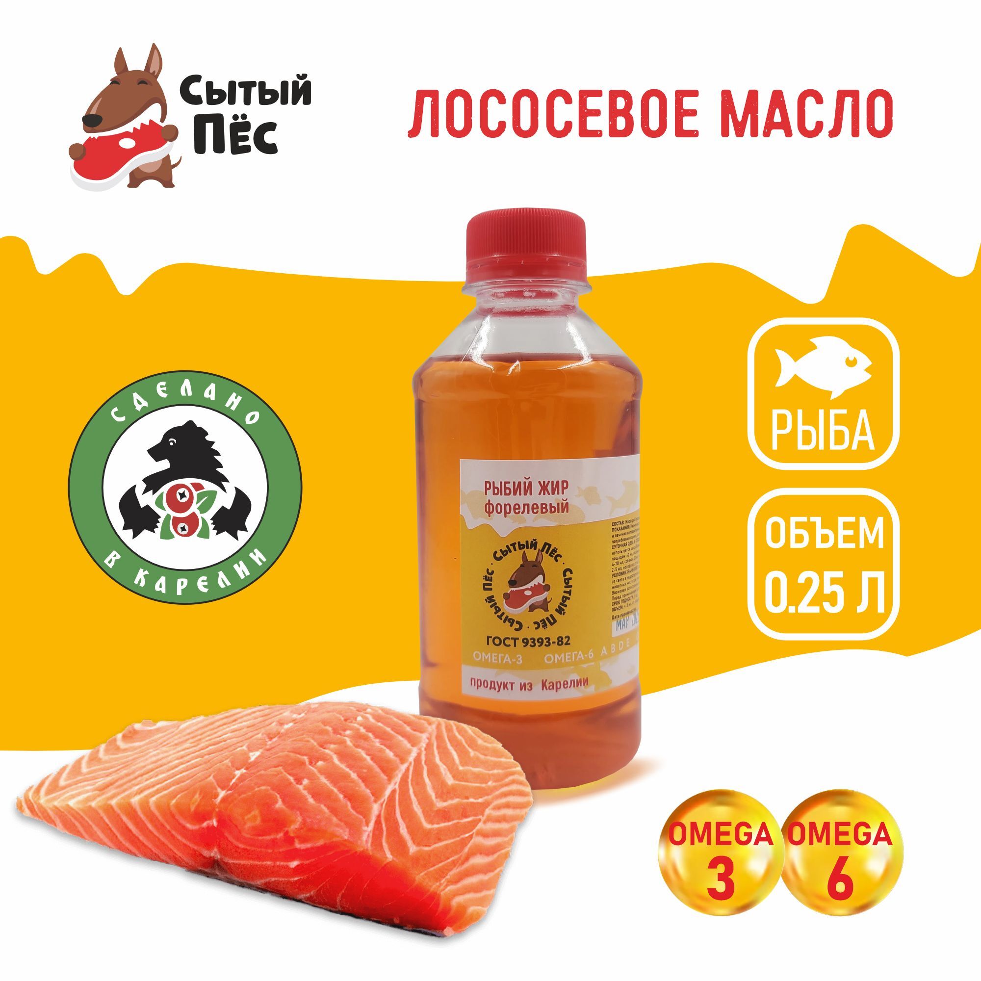 Лососевое масло от бренда “Олонецкий рыбий жир”, изготовленное специально для сети магазинов "Сытый пёс" - это экологически чистый продукт, изготовленный с соблюдением всех норм по ГОСТ 9393-82, из рыбы лососевых пород, прямиком из Карелии! Продукт не содержит искусственных ароматизаторов, консервантов и других вредных добавок.Форелевый рыбий жир является незаменимой добавкой к основному корму для собак, кошек, птиц и парнокопытных животных. Рыбий жир является ценным источником омега-3 и омега-6 жирных кислот, богат витамина A, B, D, E.Омега-3 и Омега-6 жирные кислоты помогают поддерживать здоровую кожу и блестящую шерсть у животных, способствуют улучшению кровообращения и имеют противовоспалительные свойства, снижая риск воспалений и развития нежелательных новообразований. Жирные кислоты играют важную роль в развитии животных, особенно у молодых особей. Помогает поддержать здоровье глазных тканей, что особенно важно для особей, страдающих от проблем со зрением.Также рыбий жир укрепляет иммунную систему, улучшает пищеварение и способствует нормализации работы ЖКТ.Еще одно полезное свойство - улучшение мозговой функции у животных, что способствует повышению когнитивных функций.Из ветеринарной практики - рыбий жир очень полезен в профилактике и лечении гипоавитаминозов, рекомендуется при низком потреблении кормов и слабом приросте живого веса.Регулярное употребление форелевого рыбьего жира может способствовать общему улучшению здоровья животных, делая их более энергичными, активными и счастливыми.Самое главное, “Олонецкий рыбий жир” - это очень полезный и питательный продукт, который поможет Вашему любимцу оставаться здоровыми и активными на протяжении всей жизни!